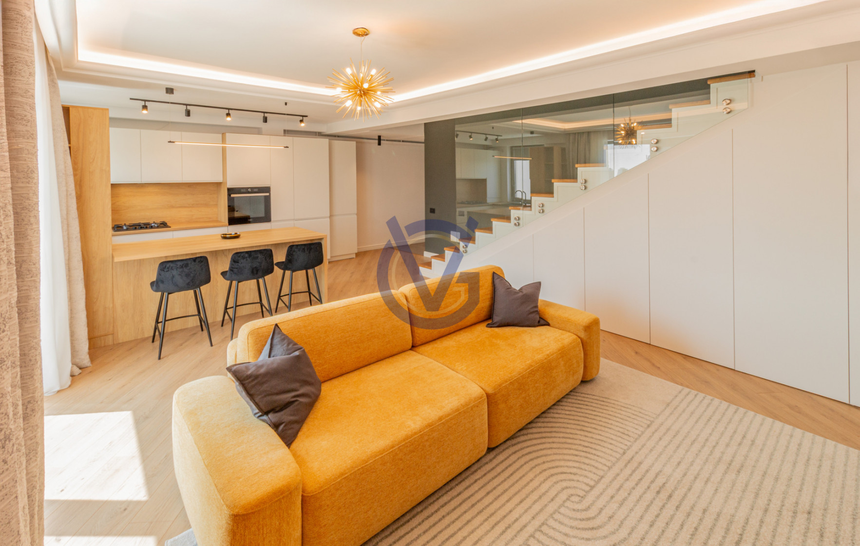 In camera de zi cu bucatarie deschisa (35.50mp) ai la dispozitie absolut tot ce iti trebuie: canapea comoda, ca sa te uiti la programele preferate la televizor, si foarte multe spatii de depozitare. Peninsula bucatariei iti ofera loc pentru a lua cina cu familia si prietenii. Este echipata cu electrocasnice de la Whirlpool si Grundig, iar centrala proprie Viessman iti ofera confortul termic prin incalzirea in pardoseala. Musafirii pot folosi grupul sanitar cu dus, situat la nivelul inferior, al camerei de zi.