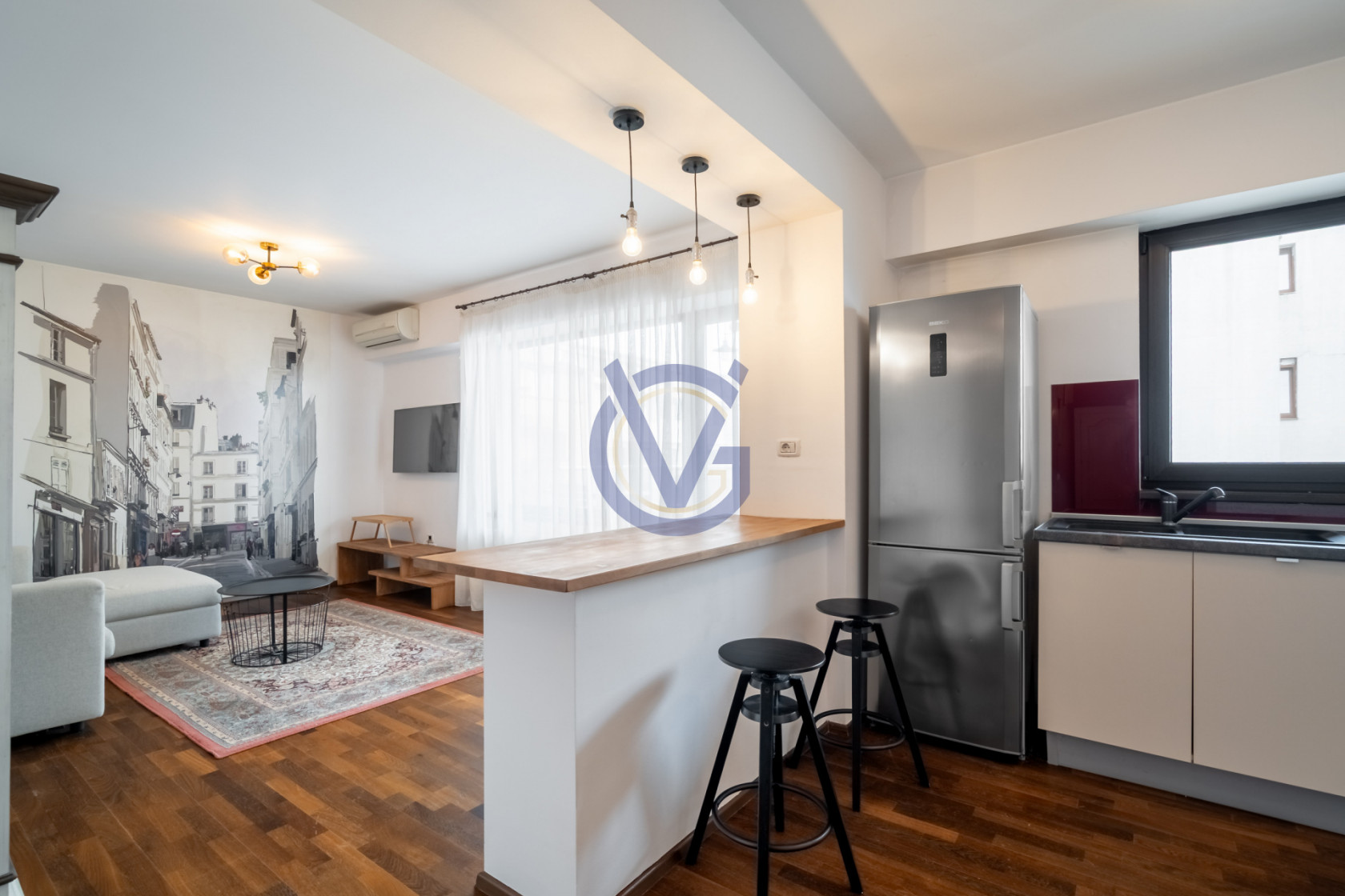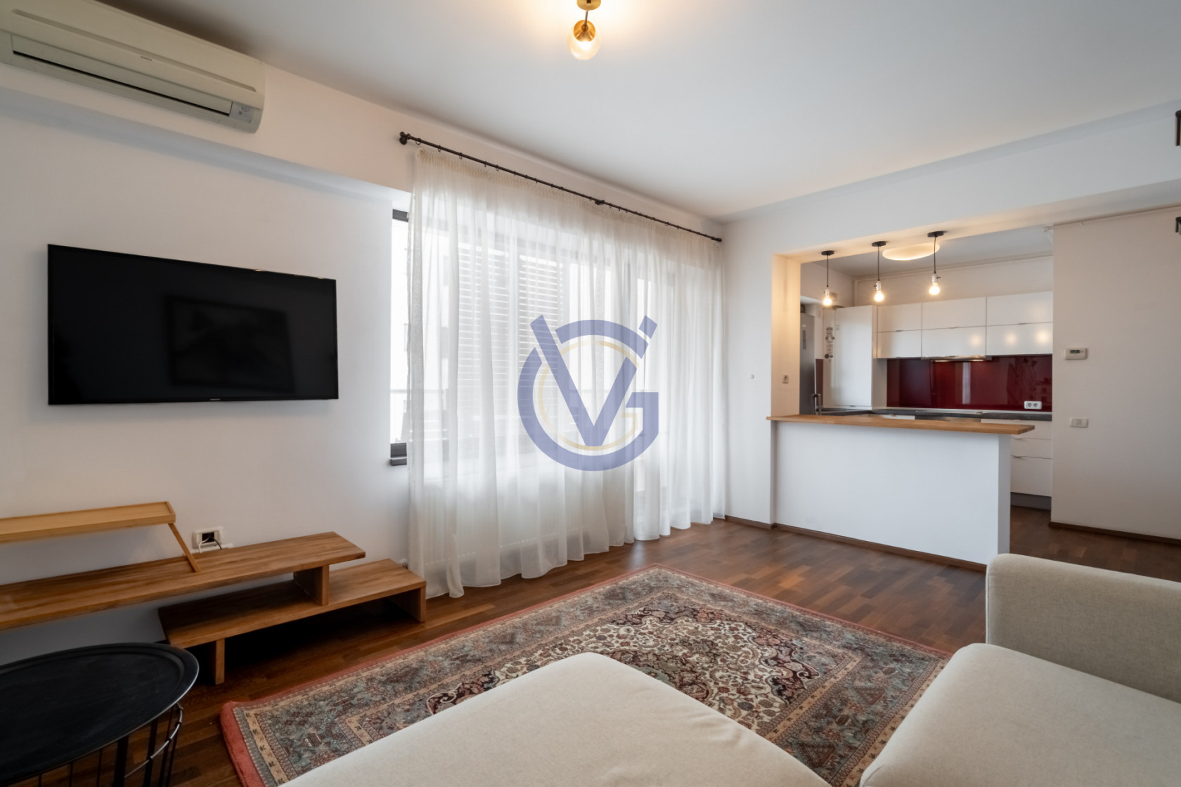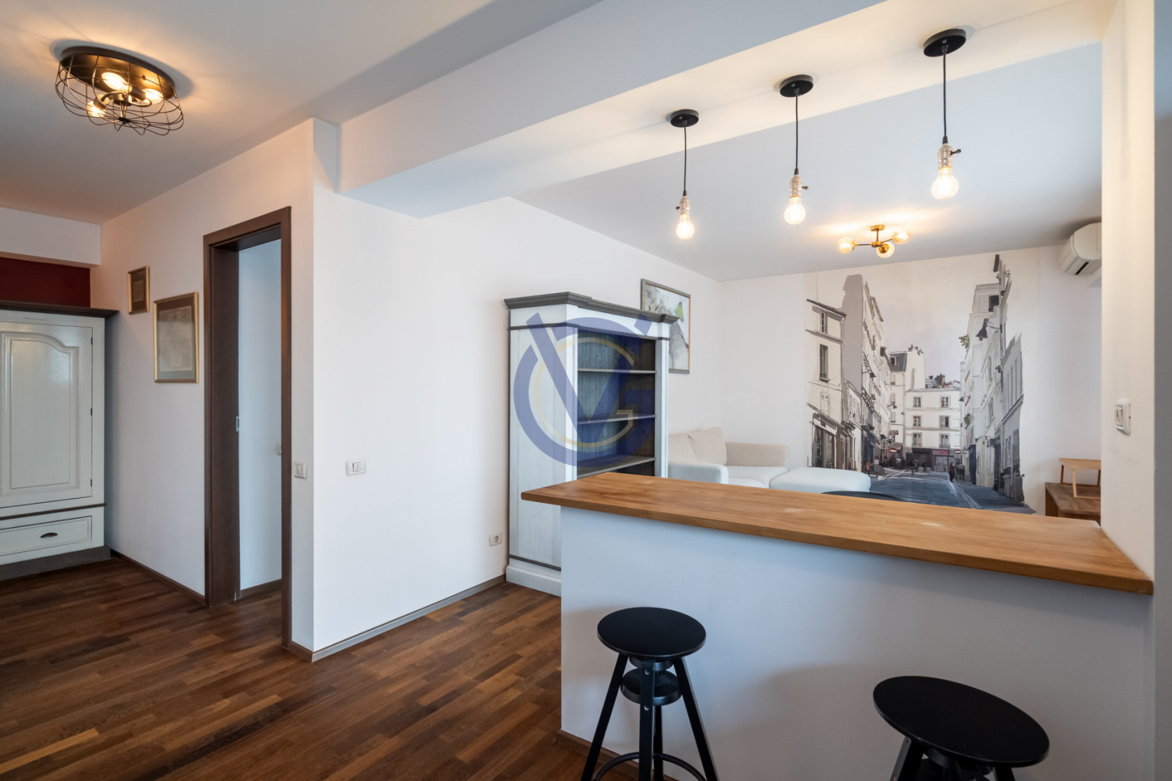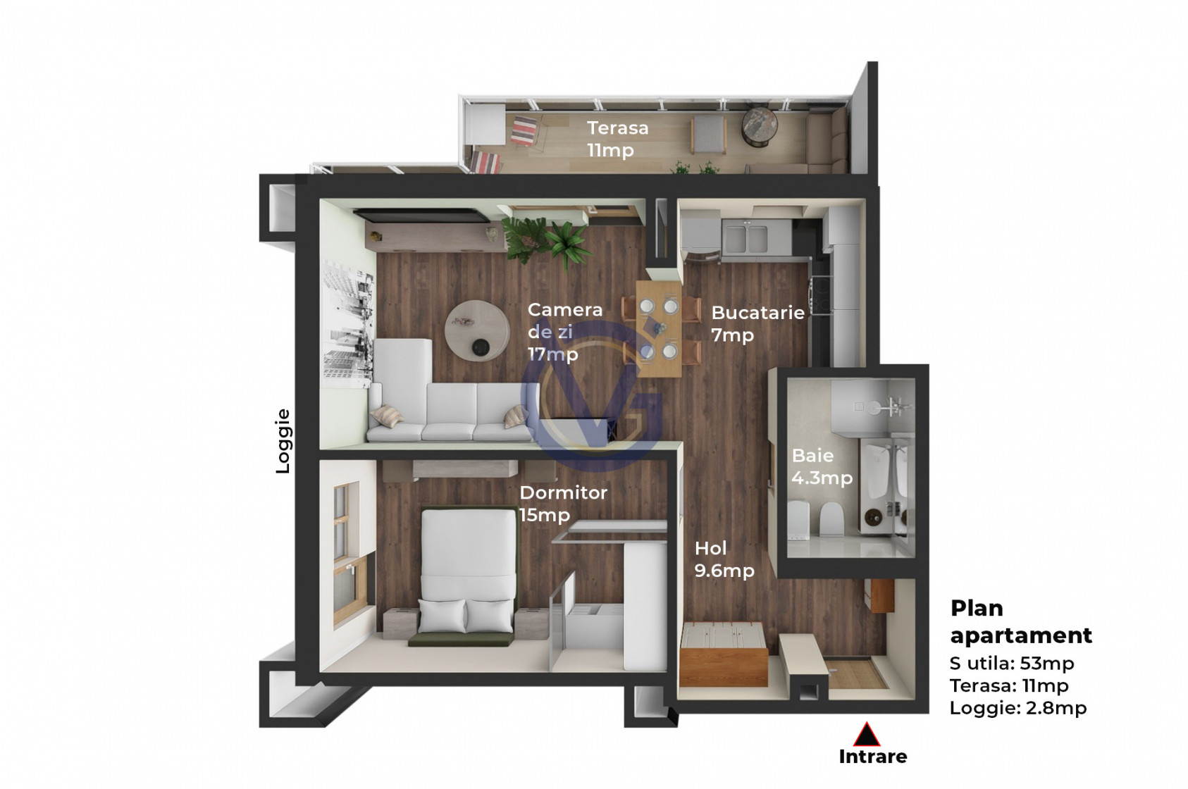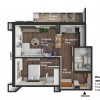 In holul spatios de 9.60mp ai spatiu pentru amenajarea cuierului si a unor depozitari utile. In camera de zi (17mp) este suficient loc pentru a aduna cativa prieteni o sueta, sau la a sta in jurul mesei de bar din bucatarie (7mp), la un pahar de vin. In dormitorul de 15mp a fost amenajat in mod ingenios un dressing, astfel incat sa nu mai ocupi spatiul cu alte dulapuri.
