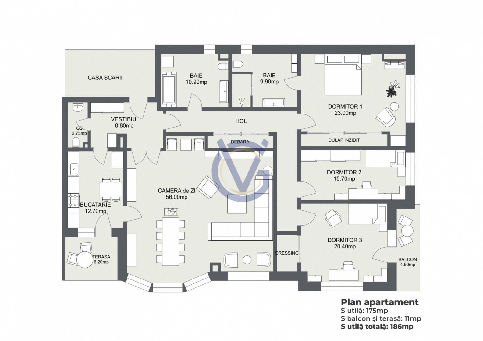 Apartamentul are o suprafata utila de 175mp, decomandat, la care se adauga o terasa si un balcon a caror suprafete insumeaza 11mp. Din holul larg, cu spatiu suficient pentru depozitarea hainelor, patrunzi intr-o senzationala camera de zi: 56mp! Cum ar fi ca de Craciun sa poti pune masa pentru doisprezece persoane, copiii sa se bucure in jurul bradului, si tot sa ramana loc si pentru dans?