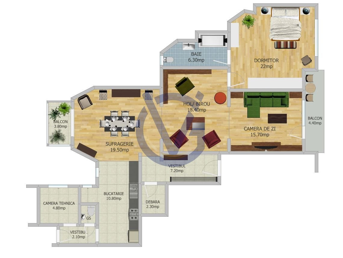 Zonele publice ale apartamentului sunt completate de spatii anexe: debara, camera tehnica si grup sanitar.